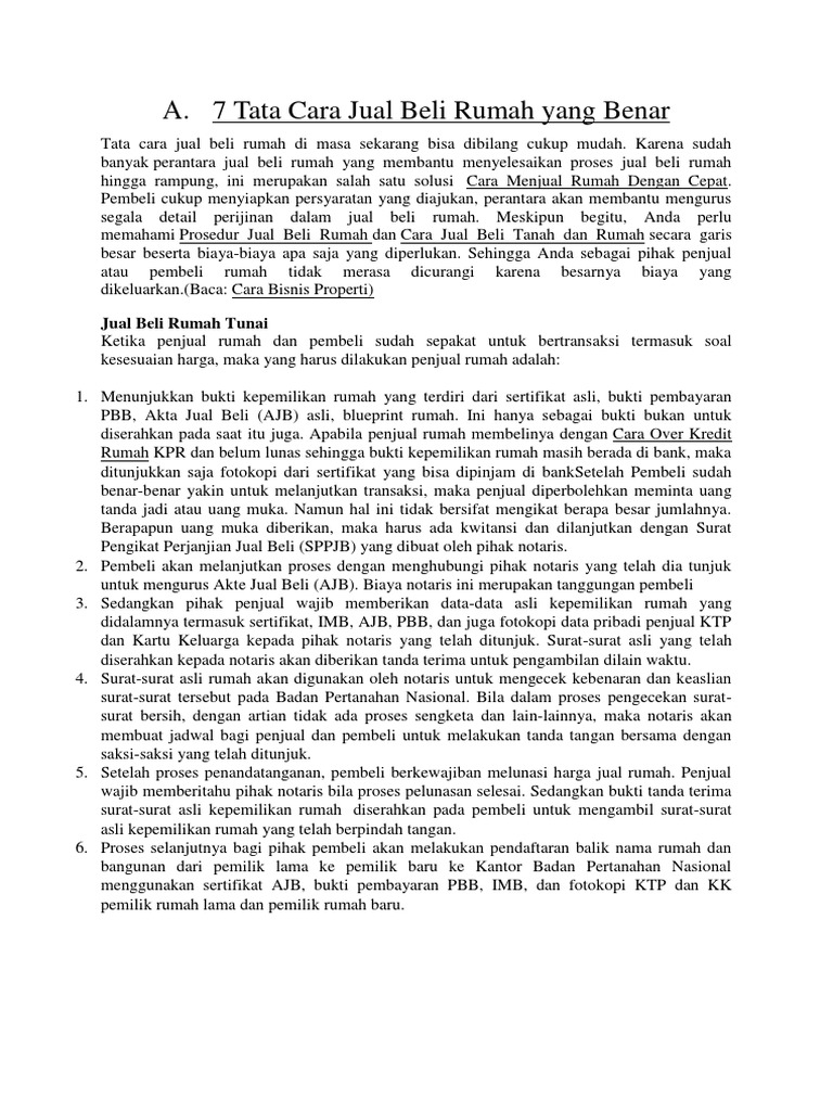 Terang artinya di lakukan di hadapan pejabat umum yang berwenang, dan tunai artinya di bayarkan secara tunai. Ada beberapa persyaratan dan prosedur yang harus kita pahami agar proses kepemilikan rumah berjalan dengan lancar. Banyak yang belum mengetahui pajak atau biaya tambahan jual beli rumah, sehingga baik penjual maupun pembeli tidak bisa memprediksi uang yang harus dikeluarkan. Oleh karena itu, sebelum melakukan jual beli rumah, pahami dulu enam hal semua urusan teknis jual beli rumah di atas sudah mengikuti prosedur jual beli rumah pada umumnya. Rencana saya ingin menjual rumah masih dalam kpr.